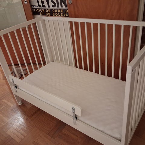 Inkl madrass, dra-på-lakan och spjälskydd. Mycket lite använd.