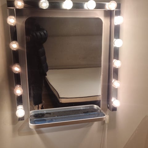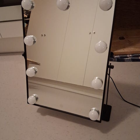 IKEA sminkespegel med inbyggda lampor runt spegelns kant. Spegeln är kvadratisk och har en ram i vitt. Lamporna är placerade på båda sidor av spegeln för jämn belysning vid sminkning eller andra detaljerade uppgifter.