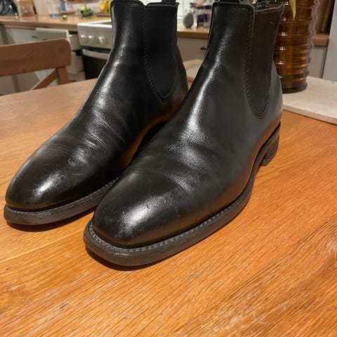 R.M.Williams stövlar i storlek 47 tillverkade i brun mocka. Stövlarna har elastiska sidor för enkel på- och avtagning.