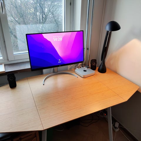 Mycket gott skick, bordsytan är i bambu och har snygg och slitstark ytbehandling. Har använts som skrivbord. Ganska ljus i färgen. Fungerar även som skrivbord.