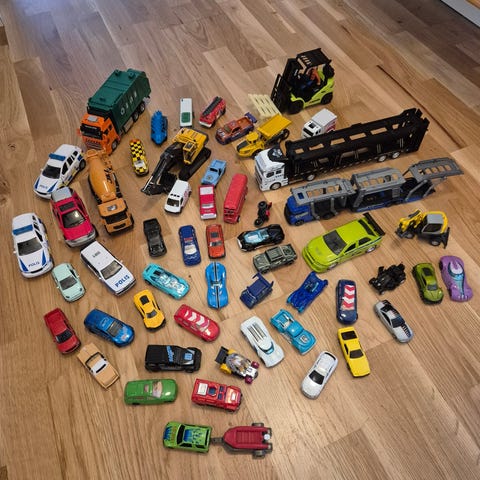 Många småbilar, några få flygplan och helikopter. Säljer med en större bil (bild 2) där man kan lägga in bilar på sidorna och bilen har även en ”rutschkana”.