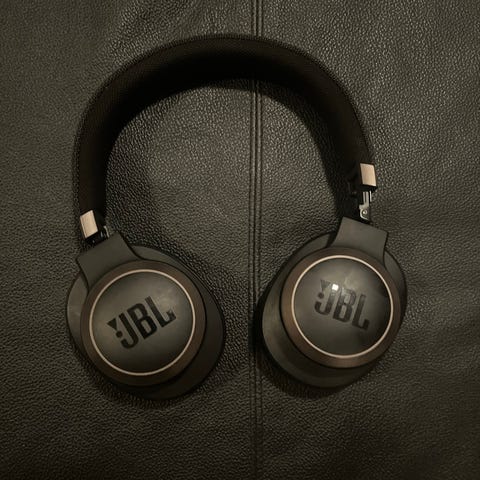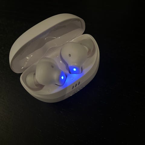 JBL trådlösa hörlurar i svart färg med laddningsfodral. Hörlurarna är designade för trådlös anslutning och bärkomfort.