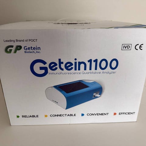 Getein 1100 Immunofluorescence Quantitative Analyzer (hereinafter called Getein 1100) is an analyzer for processing and analysis of Getein test kits including biomarkers for cardiovascular, inflammation, diabetes, thyroid function, fertility, bone metabolism, tumor, infectious disease, etc. Getein 1100 is used to measure the concentration of biomarkers in human whole blood, serum, plasma, urine, nasal swab, or saliva samples. The results can be used as an aid in clinical diagnostics of laboratory.