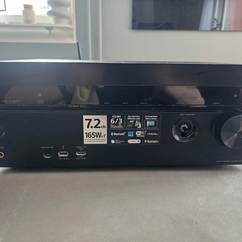 Sony Receiver för ljudsystem med flera anslutningar. ELAC Högtalare inklusive en vanlig högtalare och en centerhögtalare, designade för att användas i hemmabiosystem eller ljudanläggningar. Högtalarna har en svart finish och är lämpade för att förbättra ljudkvaliteten i olika miljöer.
