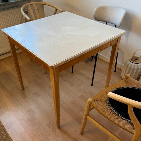 Snyggt och välbevarat nyare Perstorpsbord med extremt tålig yta med modern virrvarr-design och matchande praktiska stolar som går att torka av och stapla. Bordsbenen skruvas enkelt av och på och klickas smidigt på plats.