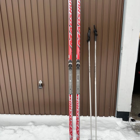 Längdskidor (150 cm) samt stavar.