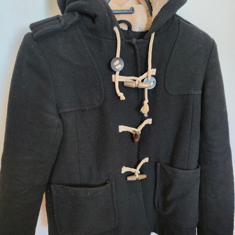 Svart jacka med dragkedjor och knappar. Jackan har en pälskrage på huvan och två fickor fram.
