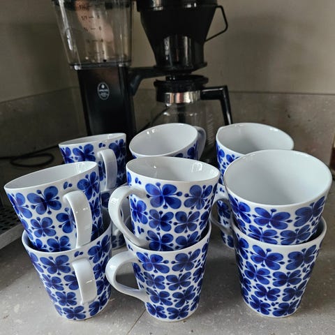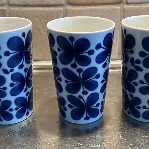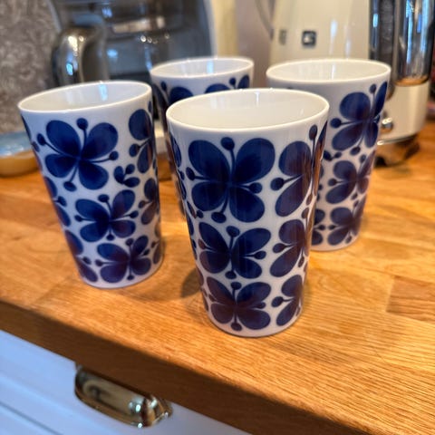 Rörstrand Mon Amie glas i 6-pack med blåvita blommönster. Tillverkade i porslin, användbara för servering av drycker.
