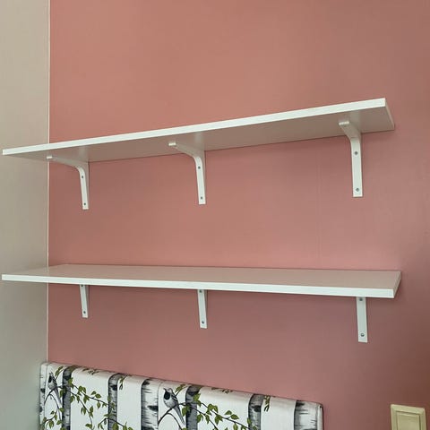 Vägghyllor i trä med vita konsoler