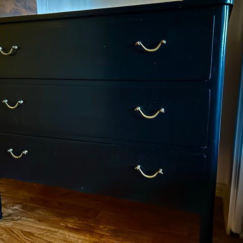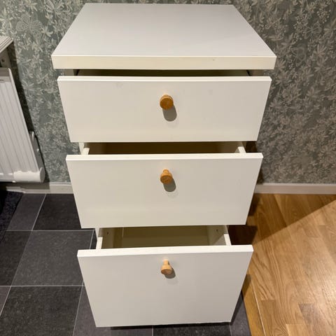 En fin liten byrå som vi använt som mediamöbel till TVn (finns hål för kablar baktill, se bild). När vi bytte tv till en större så blev denna tyvärr för liten. Vi köpte in den secondhand så vet ej fabrikat.