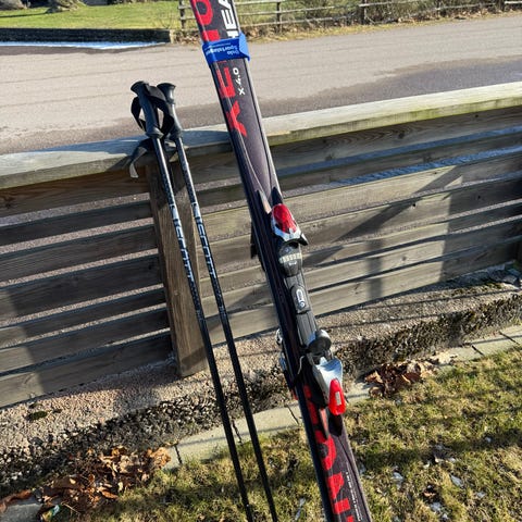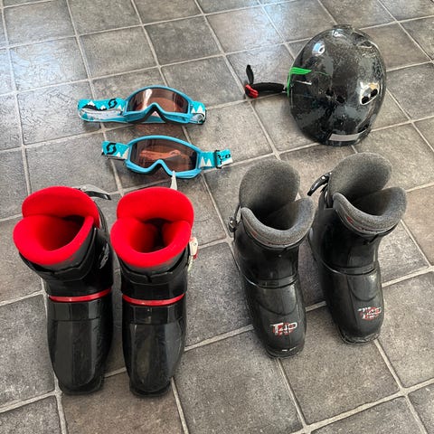 Väldigt lättknäppta Salomon-pjäxor ingår, storlek motsvarar cirka skostorlek 30. En del av klacken har gått av (se bild).
