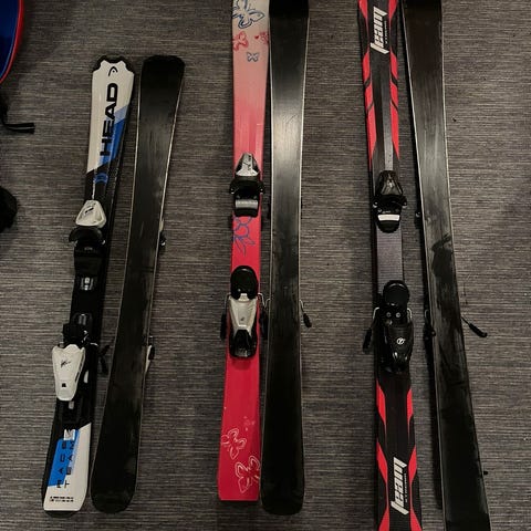 Säljer ett par utförsskidor för barn, 90 cm långa.