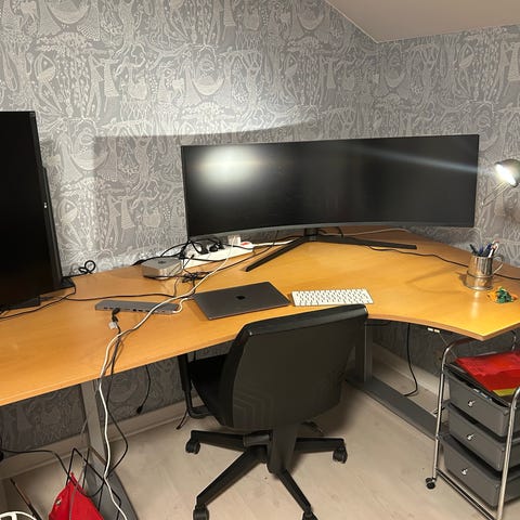 Säljer ett höj- och sänkbart skrivbord i vitt utförande. Skiva i melanin och underrede i lackerad metall. Väldigt fint skick.