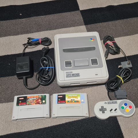 Nintendo Super Nintendo Super Mario All-Stars spelkonsol inklusive handkontroll, strömadapter, anslutningskablar och spelkassett. Konsolen är i originalförpackning med manualer och tillbehör.