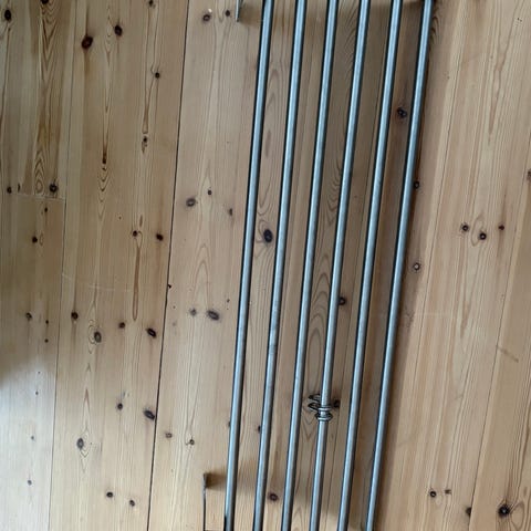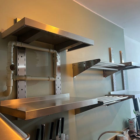 Tre stålhyllor från Adexa (storköksinredning). Vi har använt de för glas och porslin.