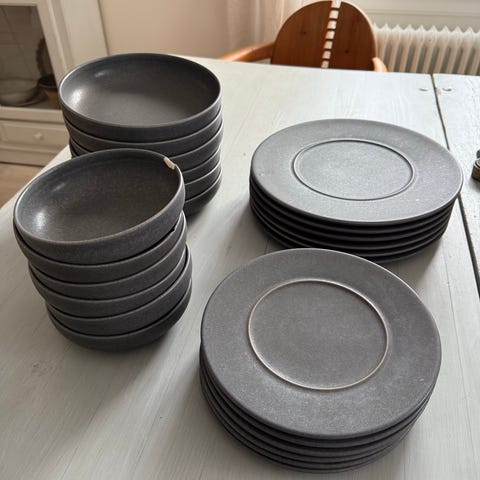 &Tradition tallrikar och skålar i grå keramik. Setet innehåller flera tallrikar och skålar i matchande färg och material, lämpliga för vardagligt bruk i köket.