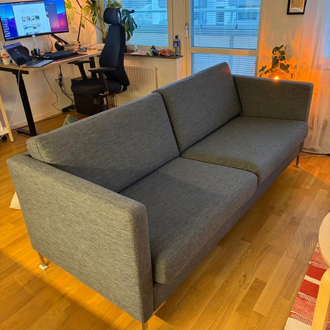 Vi säljer vår mycket bekväma soffa från Njudex i samband med flytt. Njudex är känt för tidlös design, gedigna materialval och möbler med hög komfort som håller över tid. Soffan har ett generöst och gediget sittdjup som gör den perfekt både för vardagshäng och längre kvällar i soffan – mycket skön att sitta och ligga i.