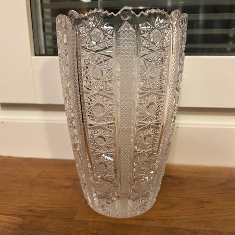 Denna typ av vas är tillverkad i bohemisk/tjeckisk kristall, ett område som varit världsberömt för kristallglas sedan 1700-talet. Under 1960–1980-talet exporterades stora mängder tungt slipat kristallglas till Skandinavien. Vaser som denna såldes ofta som exklusiva presentföremål och var uppskattade för sin tyngd, klarhet och dekorativa slipning.