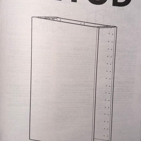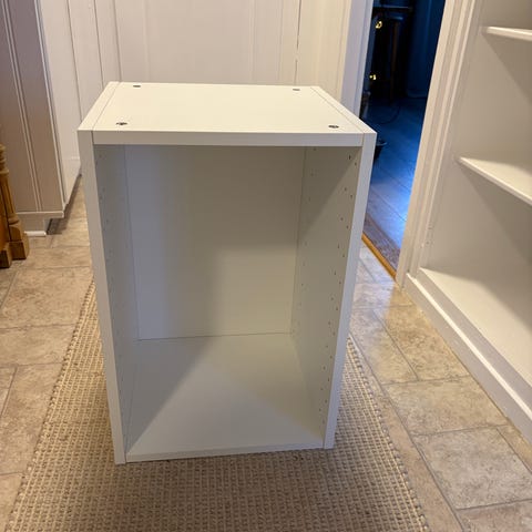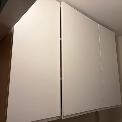 1 st väggskåpsstomme "Metod" från Ikea. Dörr "Vallstena". Använt som överskåp till Pax garderob, därav placeringen av handtagen.