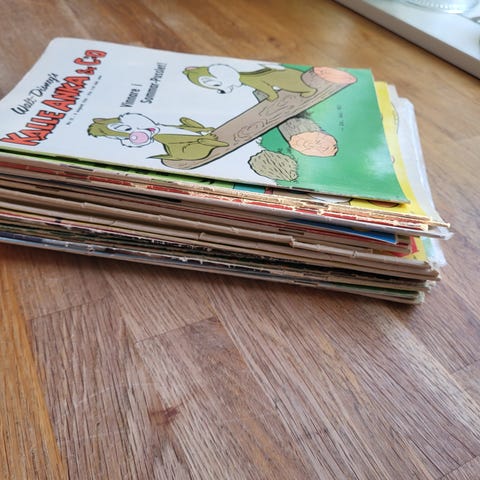Samling av Kalle Anka & Co serietidningar med olika nummer och utgåvor. Innehåller flera tidningar i varierande skick och årgångar. Finns även ett fåtal andra tidningar som Uppfinnarjocke och Musse Pigg.