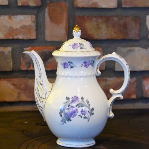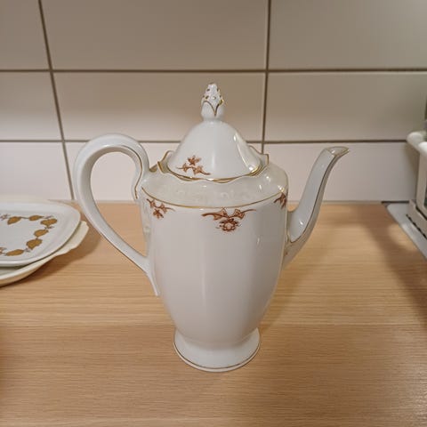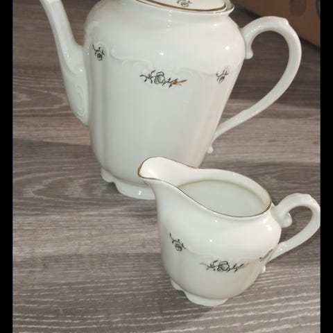 Kaffekanna och sockerskål i porslin med dekor i guld. Gott skick.