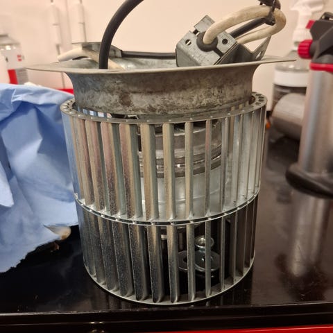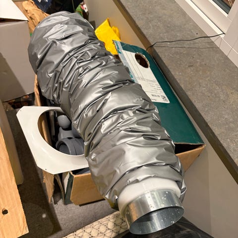 Primaklima PK125-5 ventilationsfläkt med tillhörande kanal och styrenhet. Produkten är avsedd för ventillera luften i vunden och kripgrunder