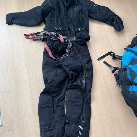 Herr-och damställ 50 resp. 38, skor strl 40. Hjälmar, läderbyxor stl33, ryggskena.