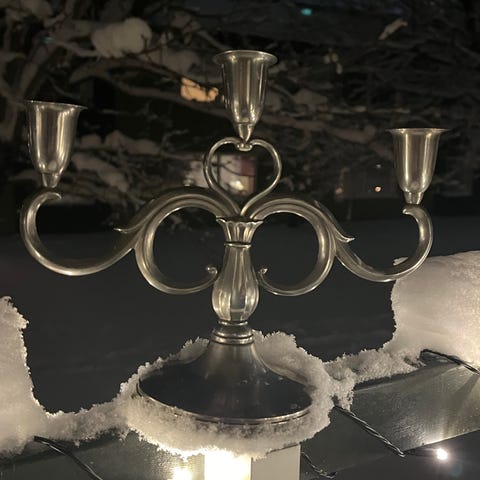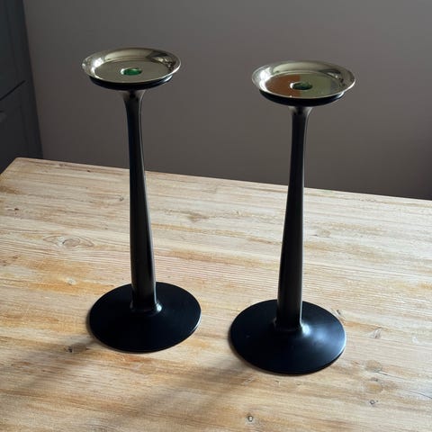 Trearmad ljusstake i svenskt tenn mörkpatinerad, Gedigen och stabil modell i klassisk svensk design troligen från mitten av 1900-talet. Passar både retro- och traditionell inredning. Normalt ålders - och bruksslitage , inget skadat eller lagat. Säljes som par.