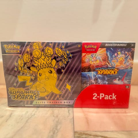 Säljer två stycken 2 pack från Pokémon TCG Scarlet & Violet Surging Sparks. Allt är nytt och fabriksförseglat.
