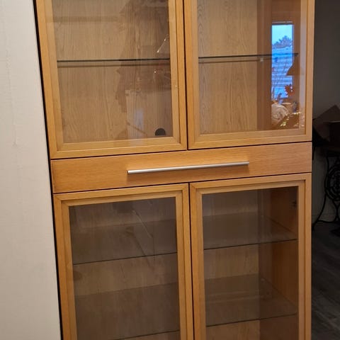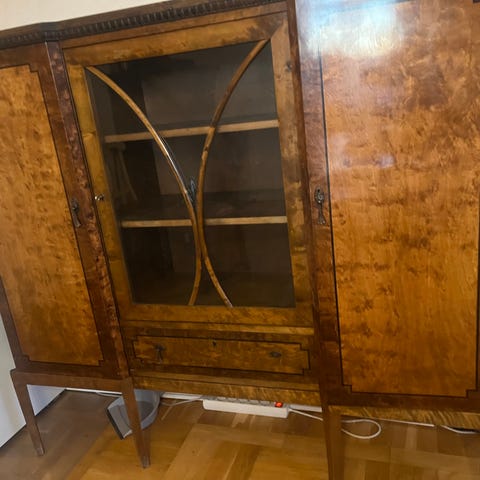 Litet dekorativt vitrinskåp i gammal stil. Ljusgrå färg. 3 hyllplan.
