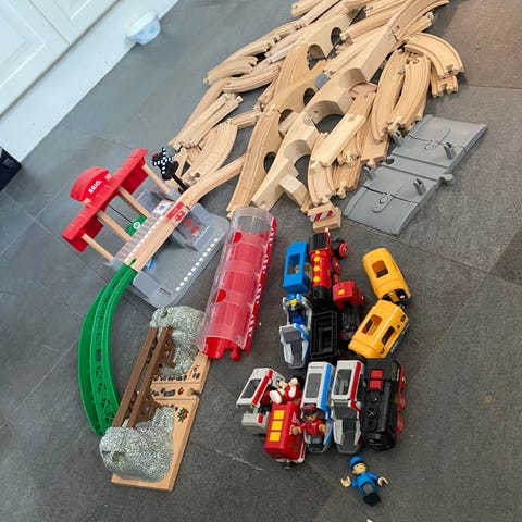 BRIO Barnleksak tågbana set med trädelar, spår, broar och tillbehör. Setet innehåller olika delar för att bygga en tågbana, inklusive broar, tunnlar och räls. Passar för barn och är tillverkad av trä och plast.
