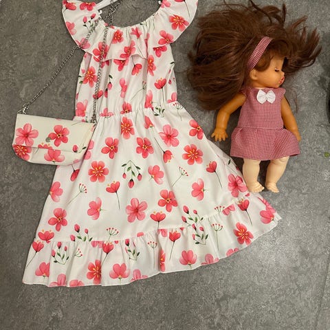 Mycket fina kläder till liten flicka eller docka. Uppskattar storlek 50-56. Kläderna är virkade i vitt, gult och lila bomullsgarn och i stort nyskick.