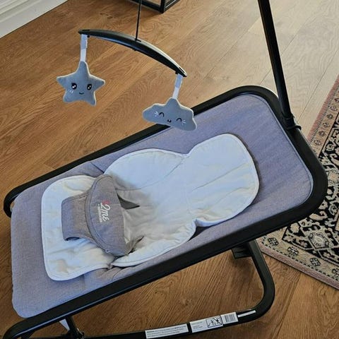 Babysitter 2me i gott skick med tre leksaker att titta på, två nallar och en boll.