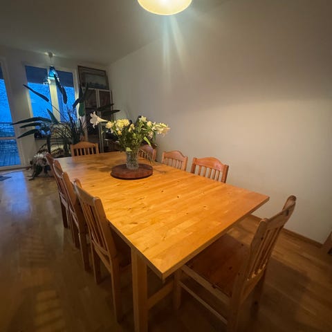 Matbord i trä med 6 stolar – stabilt & rymligt