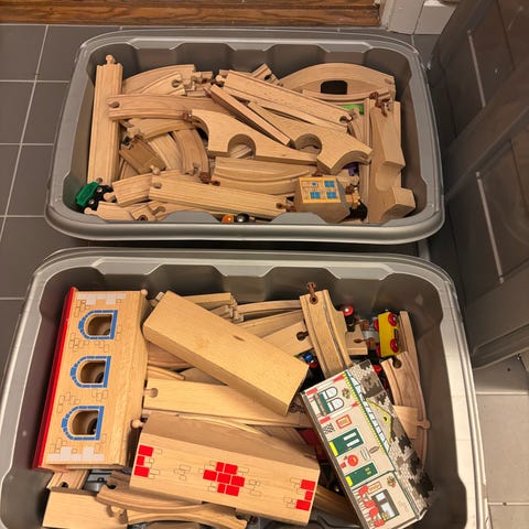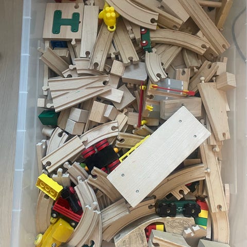 BRIO träjärnväg och mångs leksaksfordon i trä, inklusive olika tåg lastbil, skolbuss, kranbil och vagnar, samt last med magnet på ”taket” , 2 förare, och 2 hästar. Fristående lyftkran, hus och tillbehör. Setet består av flera delar som kan kombineras för att skapa en tågbana och olika scener. Leksakerna är färgglada och tillverkade av trä, avsedda för barn. Mkt fint skick, ett svart tåg något slitet, samt en tunnel någon liten repa, förövrigt i princip nyskick.