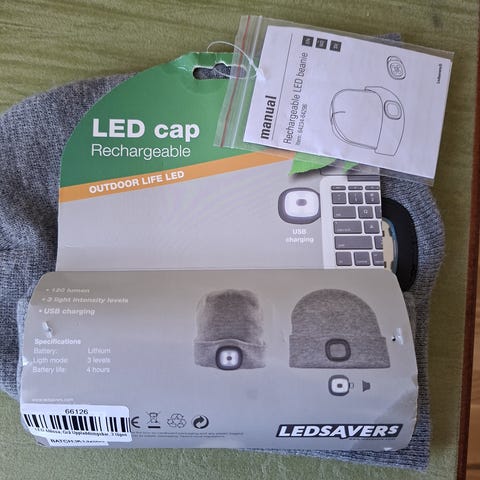 Svart mössa med inbyggd LED-pannlampa och trådlösa högtalare. Perfekt för kvällspromenader eller löpning. Mössan laddas via USB och har knappar för att styra musik och samtal direkt på sidan. Unisex-modell i mjukt syntetmaterial.