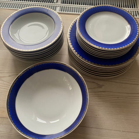 Har en savis 12st mat talirkar 8st kaffe kopp med fat en sås skål 1st och en mjölkbrina och 1st kaffekanna och 11st melan fat 3uppläggenfat en stor och liten och melan och sockerskål