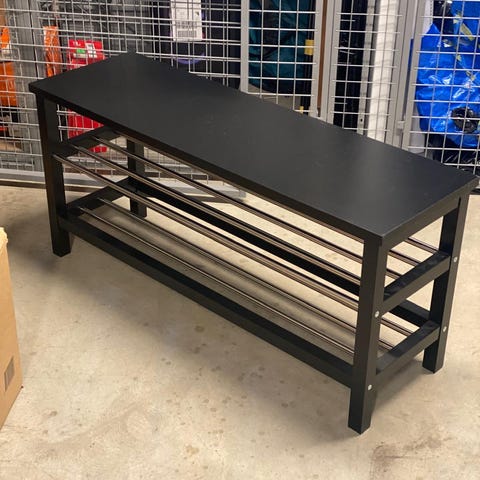 Hallmöbel med skohylla och klädhängare i svart metall. Stabil och i bra skick. Perfekt för hall eller entré. Flera krokar för jackor och två hyllplan för skor.