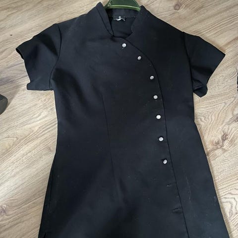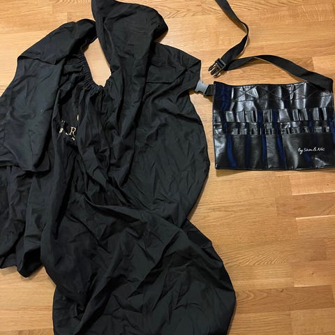 Brunt frisör förkläde med flera fickor och justerbara remmar. Förklädet har detaljer i form av silverfärgade öljetter och nitar.
