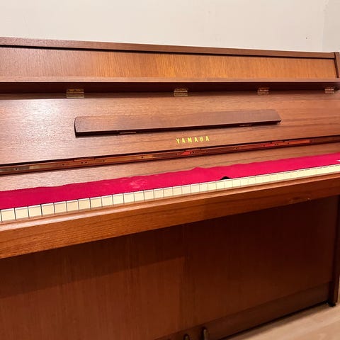 Yamaha Upright Piano i träutförande. Pianot har ett traditionellt utseende med ett komplett tangentbord och tre pedaler. Passar för både nybörjare och erfarna pianister.