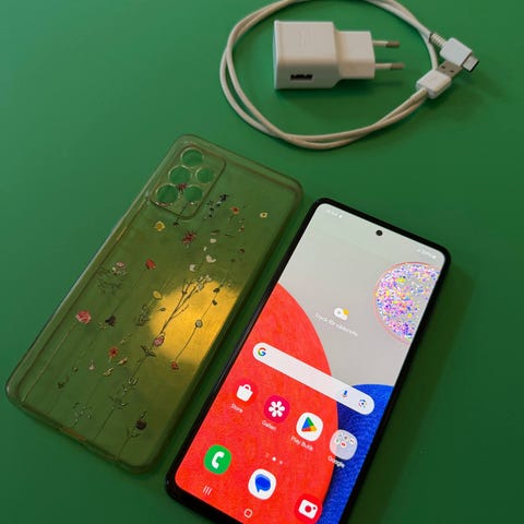 Samsung Galaxy A52 5G smartphone med 128 GB lagringskapacitet. Färgen är svart. Modellen tillhör Galaxy A-serien och stödjer 5G-nätverk.