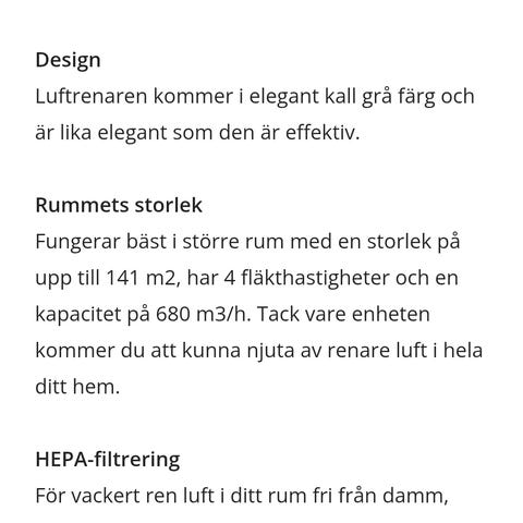 Filtret är nästan nytt och nyligen utbytt, vilket innebär att köparen får lång användningstid kvar innan nästa filterbyte behövs. Luftrenaren är tyst i drift och kan användas även nattetid utan att störa. Den har enkel touchkontroll och en stilren, kompakt design som passar in i de flesta hem.