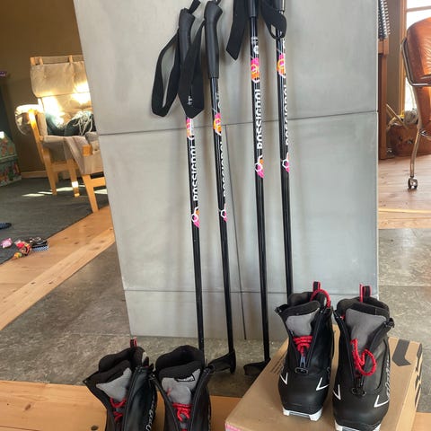 2 par vallningsfria längdskidor 120 respektve 100cm med stavar och 4 olika pjäxor. Pjäxor Salomon 30,5 resp. 31.5 och Tecno pro 34 resp 36. Helt set med skidor, stavar och pjäxor 400 kronor. Pjäxor 50kronor per par.