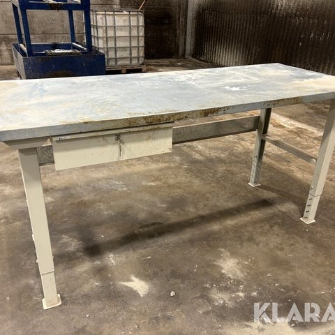 Arbetsbänk med inbyggda måttangivelser på ytan och flera klämmor för att hålla material på plats. Bänken har ett stabilt stativ och är avsedd för allmän användning vid arbete som kräver fastspänning av arbetsstycken.