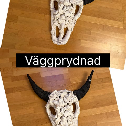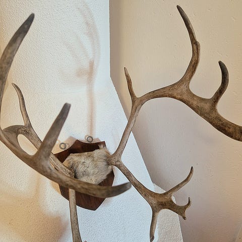 Hjortskalle med horn monterad på en svart träplatta. Modell större! Används som väggdekoration eller prydnad. Skickas ej! Endast upphämtning