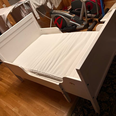 Sundvik utdragbar barnsäng i vitt. Fint skick, då den sovits i sparsamt. Använts mest som gästsäng. Inga klistermärken har suttit på sängen. Madrass ”Innerlig” ingår. Fint skick utan fläckar.
