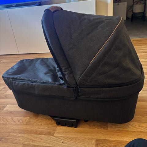 Britax Römer barnvagnsliggdel i mörkgrå färg med brunt handtag. I nyskick då vi fick ut en ny via försäkring. Knappt använd