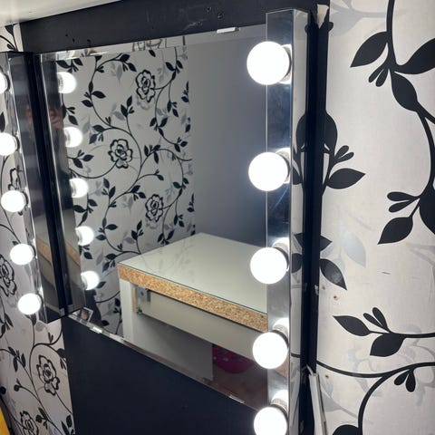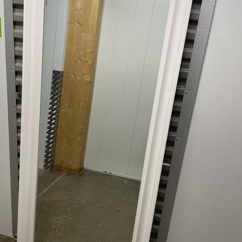 Frisörspegel med svart ram. Spegeln är avsedd för användning i frisörsalonger och har en enkel design med en svart ram som kan placeras på golvet eller monteras på vägg. Spegeln ger en tydlig reflektion och är lämplig för professionell användning. Spegeln är 197cm på höjden och 78cm på bredden. Det finns 4 stycken.