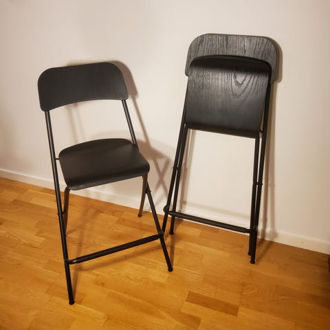 2 st IKEA FRANKLIN barstolar i vitt. Stolarna är hopfällbara och har en sitthöjd på 63 cm. Passar för användning vid barbord eller köksöar.