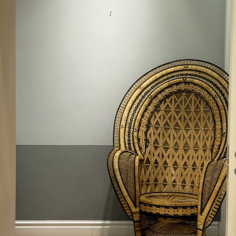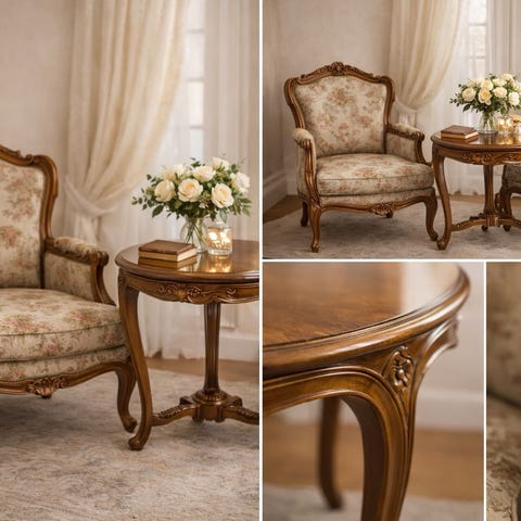 Två antika fåtöljer med rottingsits, samt ett litet runt träbord med svarvade ben säljes pga platsbrist. Fåtöljen har en rundad rygg och armstöd och bordet är av trä. Tydligt ytslitage som hör åldern till, men hela och mycket fina.
